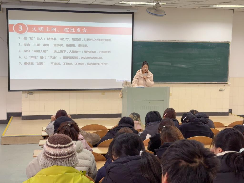 2023级学生处于承上启下的关键时期,辅导员王倩倩从学业进展、能力提升、心理调适、安全教育等方面展开讲解,提醒同学们注重专业学习与综合素质培养,提前规划未来发展,增强自我保护意识,保持积极健康的心态。