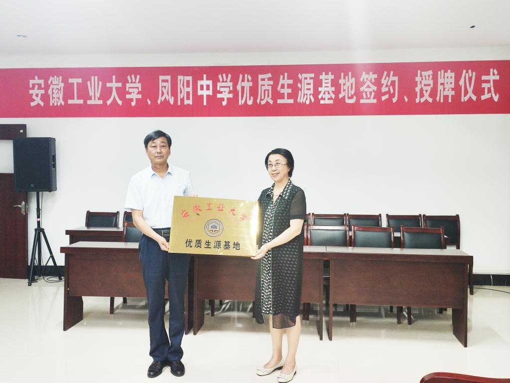 最后,汪海波院长和陈勋刚校长共同在优秀生源基地建设合作协议上签字。顾明言副校长代表学校向安徽凤阳中学授予了“优秀生源基地”牌匾。