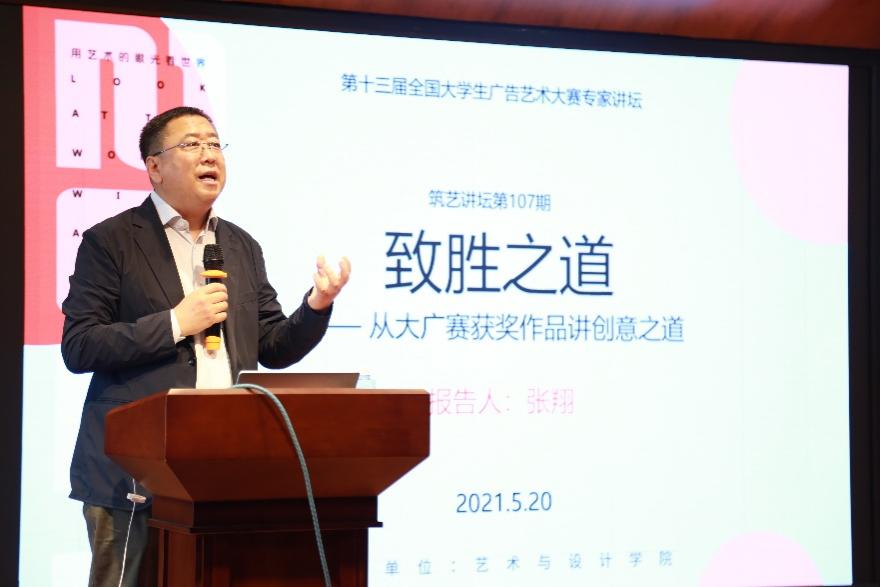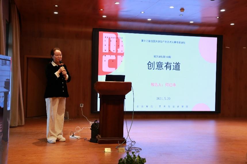 张翔教授在“致胜之道——从大广赛获奖作品讲创意之道”专题报告会中,通过往年大量的国赛获奖作品,从平面、广播、短视频以及动画的角度分别阐述了进入国赛的作品独特的视角和亮点;何红艳教授在“创意有道”专题报告会中,从创作题材的选取以及如何把握住创作思路和关键点的角度展示了创意的重要性;刘秀伟教授在“广告’奖’道理”专题报告会中,分析了广告创意方法和精神,通过大量的获奖作品分析了广告创意如何执行,并且详细讲解了2021年大赛主题。