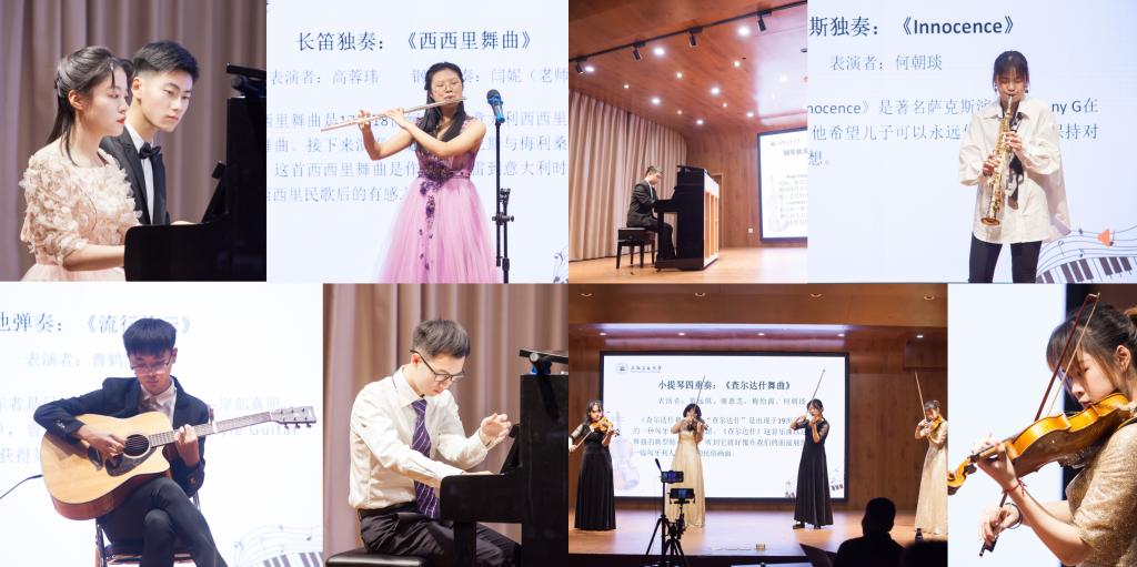小提琴四重奏《查尔达什》更是将本次听赏会现场气氛推向高潮,乐曲速度迅急而节奏鲜明,音乐力度张弛而旋律欢快,琴手们默契、稳定的配合,获得观众们一致好评。接下来,电气学院电子信息技术专业、乒乓球国家二级运动员的何朝琰同学用一首充满浪漫、温情的萨克斯曲《Innocence》获得老师、同学一致认可。在刁文轩同学精彩的钢琴独奏《River flows in you》、《Summer》后,圆满结束本场“西洋乐听赏会”活动,并邀请领导、嘉宾与演奏员们集体合影留念。