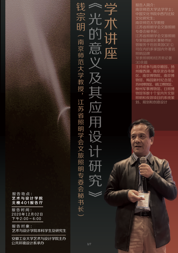 12月2日下午,受我院邀请,南京师范大学教授、江苏省照明学会文旅照明专委会秘书长钱宗明老师在教创楼北401为大家作了两场的学术报告,报告会由宋益民老师主持。