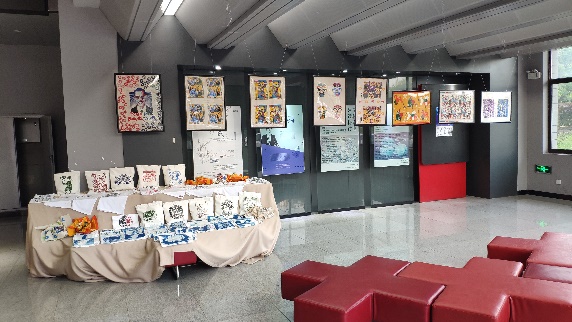 展览空间主要由多色丝网印刷创作区、蓝晒文创区、印刷文创区以及帆布袋文创区四个部分组成,多色丝网印刷创作区是这次课程成果最为重要的部分,作品主要采用多种印刷,套色工艺,并形成批量印刷效果。丝网印刷的工序分为:制图-绷网-上胶-烘干-曝光-冲版-印刷。同学们利用手工绷网器,真空晒版机和丝印专用转台等实验室器材,手工完成全部工序,从设计原稿,到绷网,晒版、显影等全部制作流程,完成一系列印刷作品需要7-8个小时。