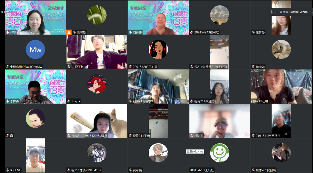 为进一步做好第十五届全国大学生广告艺术大赛的组织工作,提升学生广告设计的创意和技巧,增强作品创作质量,6月7日上午,437ccm必赢国际版邀请北京印刷学院设计艺术学院刘秀伟教授作线上讲座。艺设学院相关教师和本科生、研究生参加,会议由李林森老师主持。刘秀伟教授凭借自身丰富的竞赛指导和广告创意设计经验,向同学们分析了广告创意的执行和方法,并对我院学生作品进行了深入剖析,在主题创作、表现形式等方面给予了专业指导。