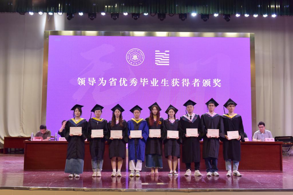在欢快的音乐声中,领导老师们依次为校“第二课堂成绩单”获得者代表、本科生校优秀毕业生获得者颁发证书。副校长顾明言为研究生省优秀毕业生、本科生省优秀毕业生获得者颁奖,全场响起阵阵掌声。