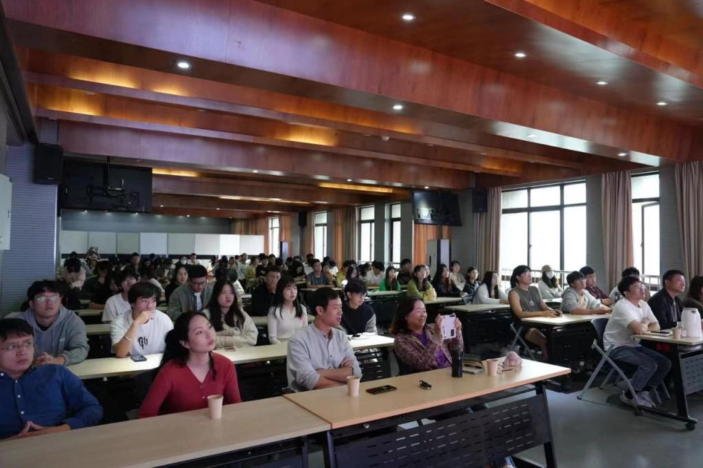 施煜庭教授从传统木结构构造技术、现代木结构构造技术、现代木结构建筑艺术三个维度给同学们展示了木结构发展演变历程。讲座中,施煜庭教授以其作品“闳约楼”为例,以中国昆曲文化和古戏台建筑的形制特征为研究对象,以现代装置艺术的视角为切入点,将昆曲戏台从大型的镜框式舞台转移至体量适中的戏台建筑中,在保留传统古戏台形制和特征建筑“意象”的同时,突显昆曲凝练和写意的艺术形式。该作品让在场人员深有触动。整场讲座深入浅出、内涵丰富,精彩的学术知识分享,让在座的师生受益匪浅,并获得了全体与会人员的热烈掌声。