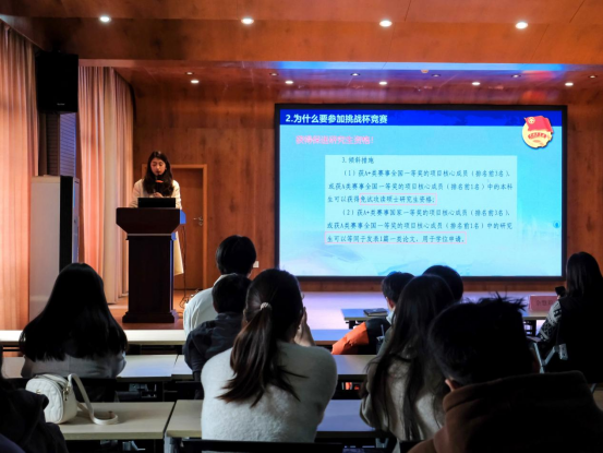 艺设学院副教授佘慧莉老师,给大家开展了一场主题为“设计+”的挑战杯培训会,首先,她结合自己所带团队的获奖作品,给大家讲解挑战杯获奖的历程,她强调挑战杯要将社会热点、团队合作、专业延展紧密结合,认真打磨材料;强调要坚持创新的同时,有效、长远行动方能行稳致远;最后她从计划书、汇报材料、比赛作品三个方面进行培训,寄语同学们从大一打好基础,不断迎接新的挑战,磨练自身技能,提升自身能力。