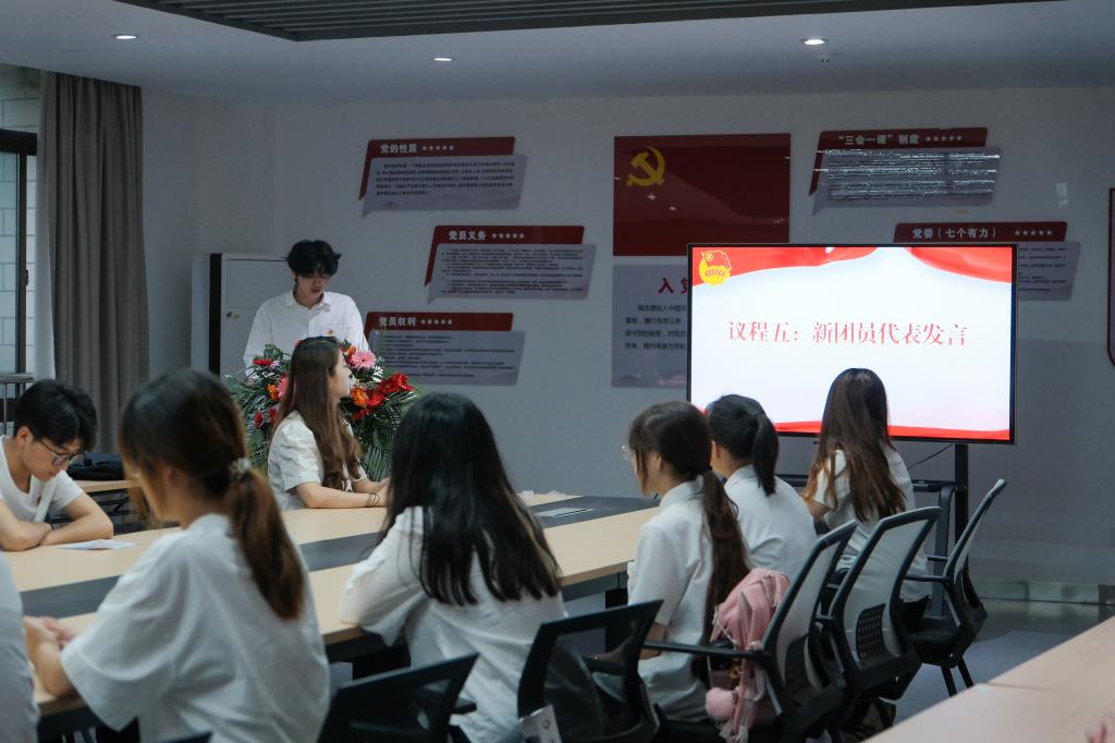 新发展团员代表傅腾坤分享入团感言,他坦言专业成绩从班级第十名跃升至第二名的成长足迹中,每一步都凝聚着汗水和努力,也闪耀着团组织关怀的光辉,每一次的进步都离不开团组织的支持与鼓励。他表示未来将继续坚定理想信念,在新的征程上铭记历史使命,以青春之名,书写壮丽篇章,共同为实现中华民族伟大复兴的中国梦而奋斗。