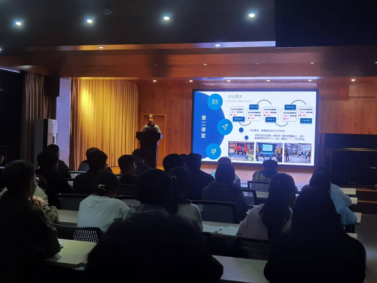 近日,学院在艺设楼北401成功举办了第二课堂政策宣讲会。大一新生辅导员汪正、院第二课堂负责人邵星以及全体2024级新生参加了此次大会。