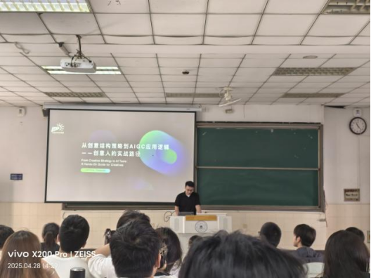 2025年4月28日下午,为深入贯彻党的二十大精神关于"教育强国、科技强国、人才强国"战略部署,全面落实立德树人根本任务,大广赛专家及上海图呗信息科技有限公司联合创始人兼首席品牌官程骅,应邀走进437ccm必赢国际版,在阶梯教室105为437ccm必赢国际版相关师生100余人带来题为“创意思维训练与AIGC融合——从商业角度看待赛事命题”的专题学术讲座。