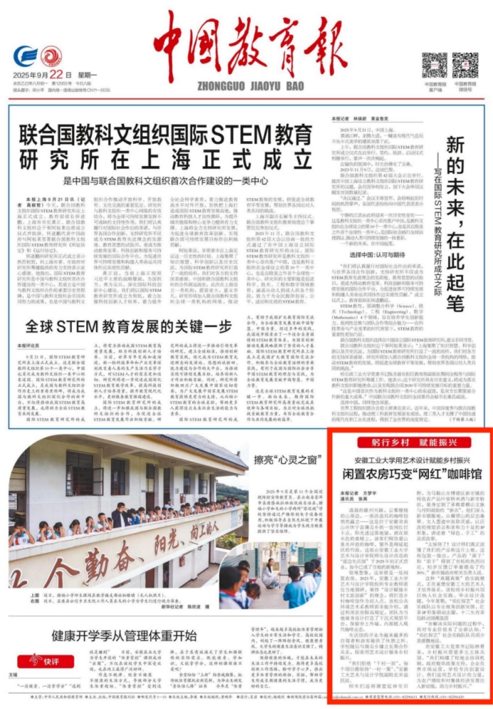 近日,我院服务乡村振兴的显著成果获得国家级主流媒体高度关注。9月22日,教育部主管的权威媒体《中国教育报》在头版显著位置刊登文章《bwin必赢线路检测用艺术设计赋能乡村振兴 闲置农房巧变“网红”咖啡馆》,深度报道了学院师生团队利用专业特长,将艺术设计融入乡村建设,成功激活乡村闲置资源的创新实践。