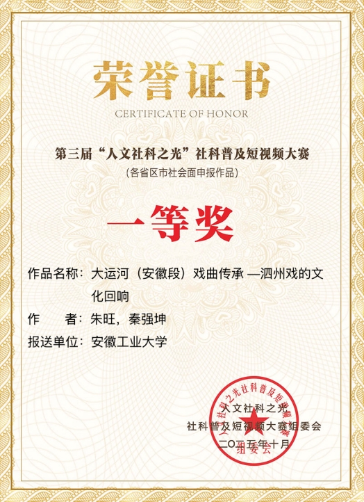 近日,由全国各省社科联联合主办的2025年第三届全国“人文社科之光”短视频大赛获奖揭晓,我校报送的作品《大运河(安徽段)戏曲传承——泗洲戏的文化回响》从众多参赛作品中脱颖而出,荣获全国一等奖。