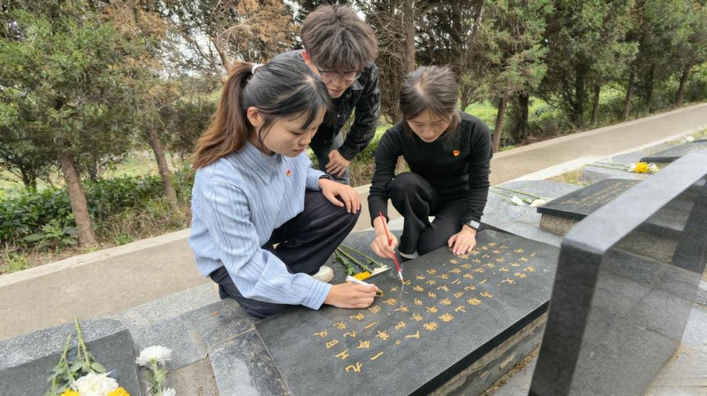 活动现场,师生们怀着无比崇敬的心情,认真为烈士墓碑清洁、描金。一笔一画的描摹,不仅让英烈英名重焕光彩,更将对先烈的追思与敬仰融入指尖,在沉浸式实践中传承红色信仰、厚植爱国情怀。参与师生表示:“墓碑描金的每一笔都是对英烈的致敬,这次活动让我深刻感悟到革命精神的力量,更坚定了我奋进新征程的决心。”
