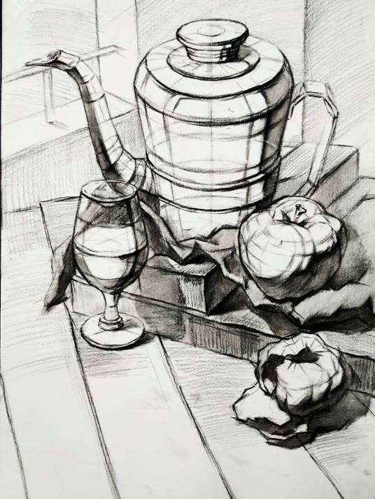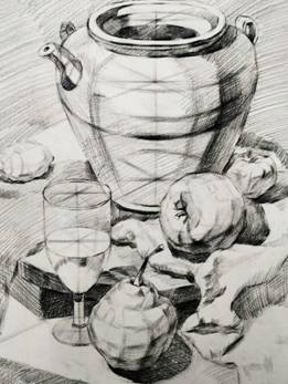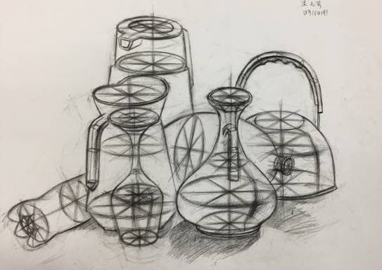3)现实形态的写生解析。在未经组合摆设的一大群瓶罐(或其他物品)中自行选择,组合和构图。自由选择瓶罐的数量,利用大小、方圆、粗细、高低等对比要素加以组合,利用和谐统一的原理加以规整,自然生发的延长线、中轴线、辅助线帮助建立了明确的节奏秩序,在这个过程中,逐渐建立画面的结构关系。