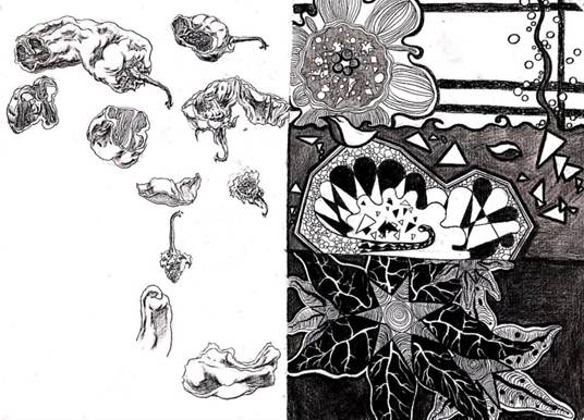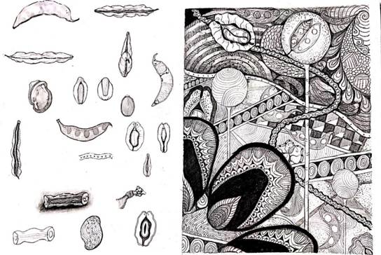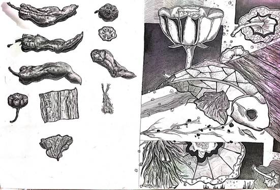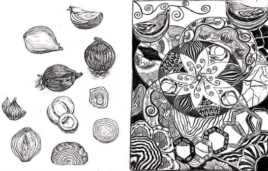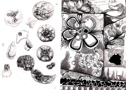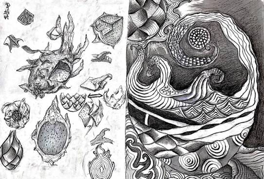 (1)自然形态的写生解析。选择自然形态作形态的分析,这种分析包括了从外部到内部的研究(例如橘子的剖析)及形态单元分析(例如花朵的分析)微观图形的分析(细胞摄影的放大)与宏观景象的对比等。