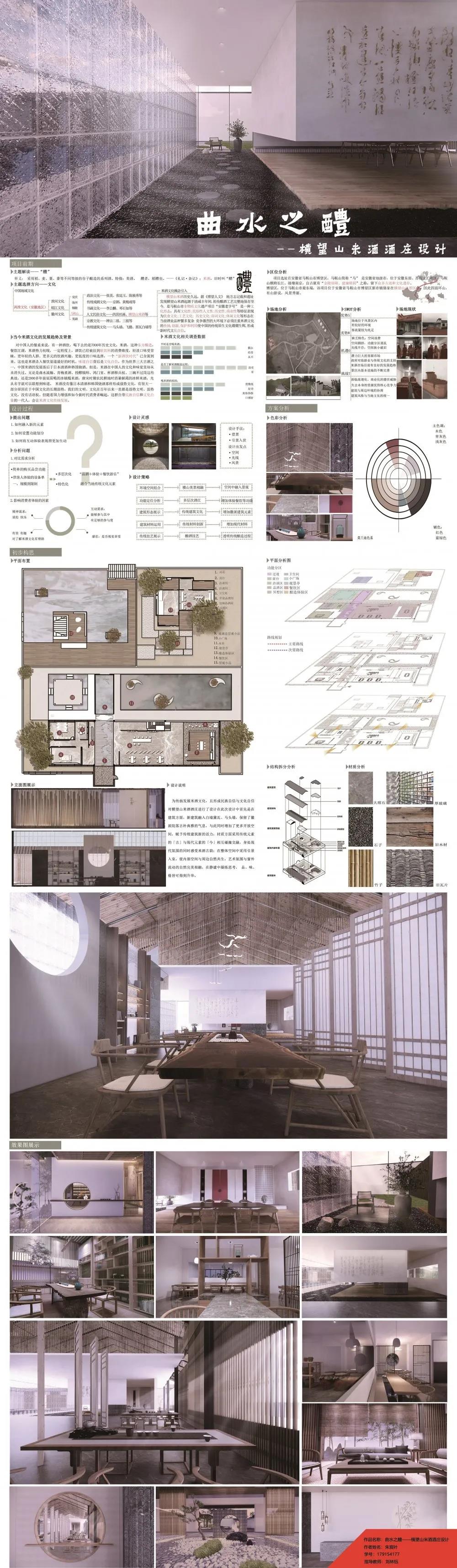 设计说明:为传扬米酒文化,形成民族自信与文化自信,对横望山米酒酒庄进行了设计;在建筑方面,融入马头墙保留徽派院落古朴气息,增加开放空间,赋予传统建筑新活力;材质方面,传统元素与现代元素碰撞交融;整体空间中采用引景入室,使内部空间与周边自然共生。