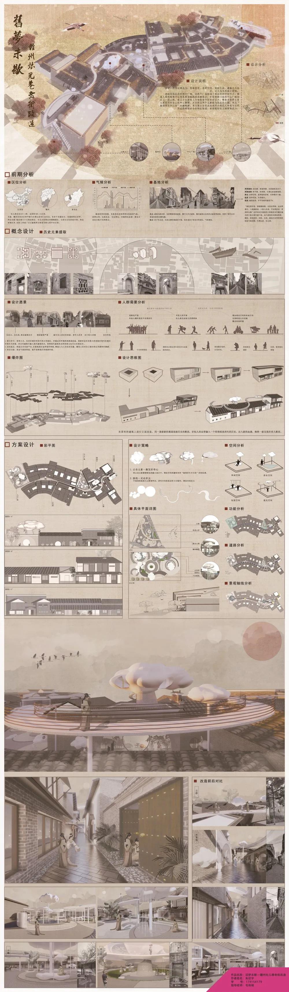 设计说明:本设计的设计理念为:传承历史、多样空间、美好生活。遵循古今结合,以人为本的设计原则。整条老街的主要元素采用的是云纹和云雕塑,并且将这两个元素做为改造的主题,突出“偷得浮生半日闲”的趣味感。本方案主旨是改造成符合现代人审美与古代历史韵味相结合的网红街道,希望能给灶儿巷带来活力。