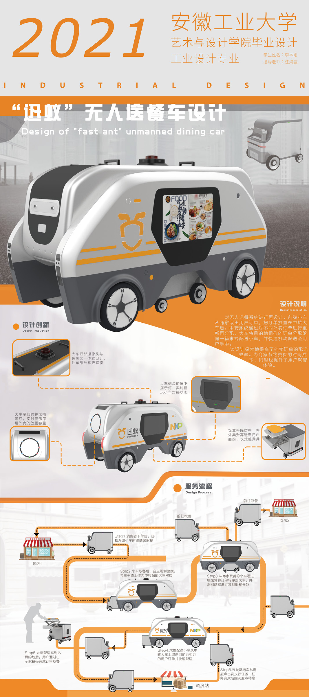 设计说明:对无人送餐系统进行再设计,前端小车从商家取出用户订单,把订单放置在中转大车后,中转系统通过对不同外卖订单进行重新再分配,大车将目的地相似的订单分配给同一辆末端配送小车,并快速机动配送至用户手中。该设计极大地提高了外卖订单的配送效率。为商家节约更多的时间成本,同时也提升了用户就餐体验。