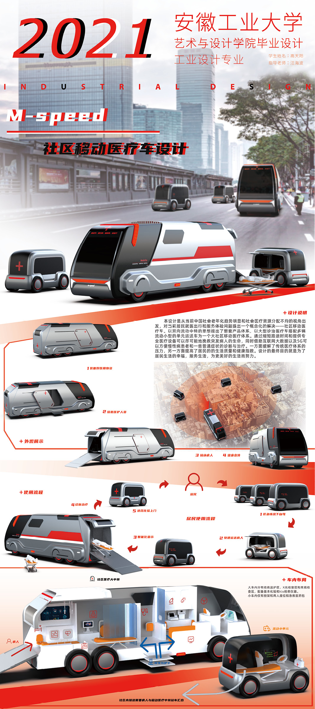 设计说明:本设计是从当前中国社会老年化趋势明显和社会医疗资源分配不均的视角出发,对当前居民就医出行和服务体验问题提出一个概念化的解决——社区移动医疗车。以双向流动中转的思想提出了整套产品体系,以大型诊治医疗车搭配多辆流动小型的单元运送车为一个大社区移动医疗体系。通过缩短路途时间和提供专业医疗设备可以尽可能地挽救突发病人的生命,同时借助互联网大数据以及5G可以方便慢性病患者和一些普通症状的诊断与治疗。一方面缓解了传统医疗体系的压力,另一方面提高了居民的的生活质量和健康指数。设计的最终目的就是为了居民生活的幸福,服务生活,为更美好的生活而努力。