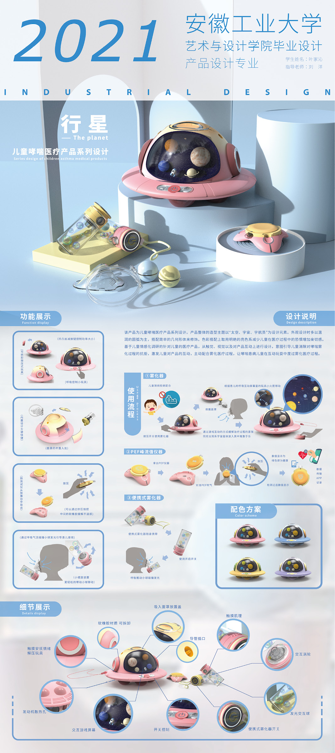 设计说明:该产品为儿童哮喘医疗产品系列设计。产品整体的造型主题以“太空、宇宙、宇航员”为设计元素。外观设计时多以温润的圆弧为主,搭配简单的几何形体来修饰。色彩搭配上取用明艳的亮色系减少儿童在医疗过程中的恐惧增加亲切感。基于儿童情感化调研的针对儿童的医疗产品,从触觉、视觉以及对产品互动上进行设计。意图引导儿童消除对哮喘雾化过程的抗拒,激发儿童对产品的互动,主动配合雾化医疗过程,让哮喘患病儿童在互动玩耍中度过雾化医疗过程。
