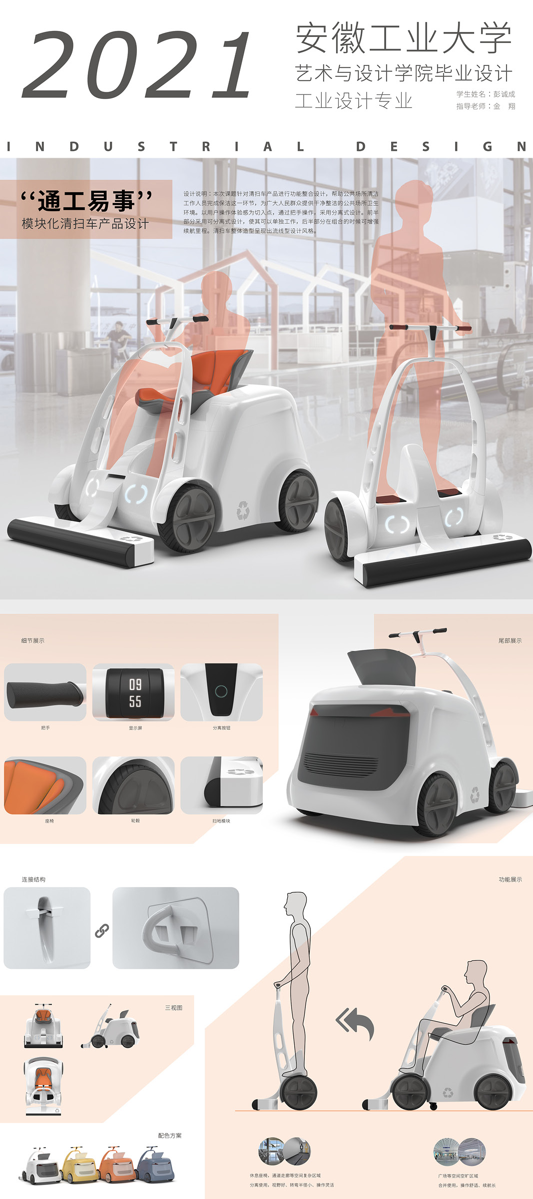 设计说明:本次课题针对清扫车产品进行功能整合设计,帮助公共场所清洁工作人员完成保洁这一环节,为广大人民群众提供干净整洁的公共场所卫生环境。以用户操作体验感为切入点,通过把手操作,采用分离式设计。前半部分采用可分离式设计,使其可以单独工作,后半部分在组合的时候可增强续航里程。清扫车整体造型呈现出流线型设计风格。