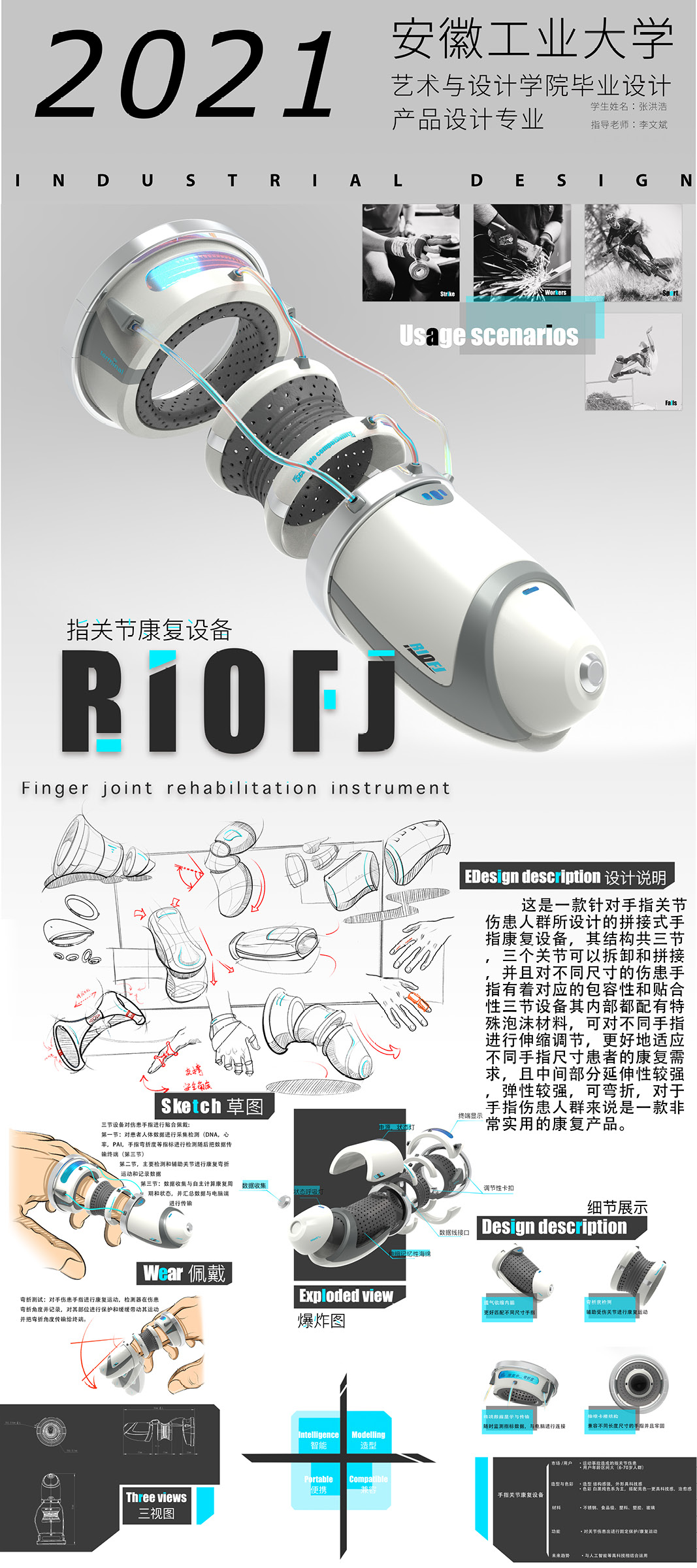 设计说明:这是一款针对手指关节伤患人群所设计的拼接式手指康复设备,其结构共三节,三个关节可以拆卸和拼接,并且对不同尺寸的伤患手指有着对应的包容性和贴合性三节设备其内部都配有特殊泡沫材料,更好地适应不同手指尺寸患者的康复需求,对于手指伤患人群来说是一款非常实用的康复产品。