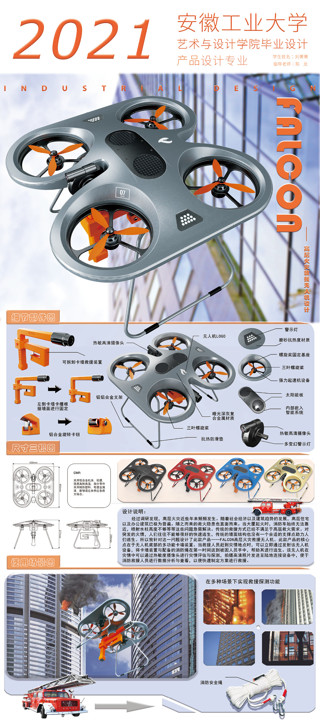 设计说明:此款产品的核心点在于无人机底部的多功能卡墙装置。当救援人员赶到灾情地点时,可以立即通过发射该无人机设备,将卡墙装置与配备的消防绳在第一时间送到被困人员手中,帮助其进行逃生。该无人机在灾情中可以通过热敏度摄像头进行灾情评估与探测,拍摄高清照片发送至陆地连接设备中,便于消防救援人员进行数据分析与查看,以便快速制定方案进行救援。