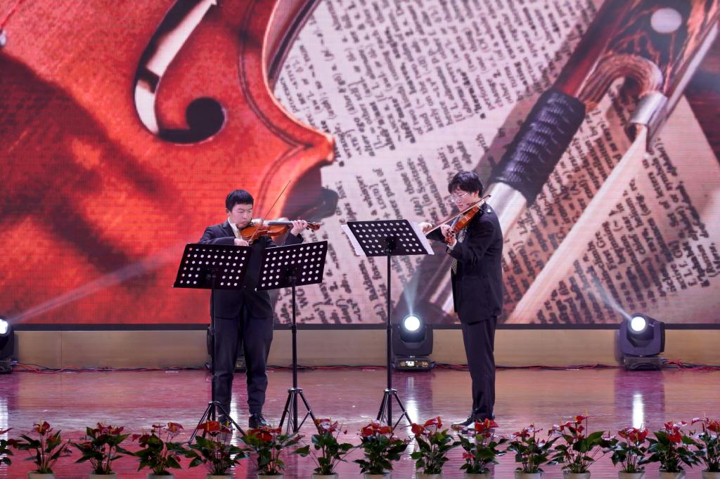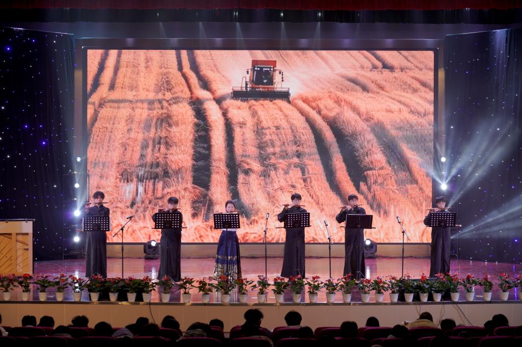 音乐会在民乐合奏《京调》中欢乐开场,将京剧曲调的韵味与民乐的独特魅力完美融合,瞬间点燃了现场气氛。随后的《阿里山之歌》又将观众带入了台湾地区那风光旖旎的阿里山,清新的旋律如微风拂面,让人仿佛置身于美丽的宝岛。小提琴二重奏《帕萨卡利亚》(亨德尔)时而低回婉转,时而高亢激昂展现了西洋古典音乐的深邃与优雅。二胡齐奏《葡萄熟了》《良宵》使听众们在欢快活泼舒缓悠扬的气氛之中流转。大提琴齐奏《大鱼海棠》和《穿越时空的思念》的旋律深沉醇厚,带领观众们亲临奇幻与感动的世界。古筝合奏《茉莉花》《市集》的旋律时而清新优雅时而灵动,让人如痴如醉。观众们在《贝加尔湖畔》的旋律中,感受贝加尔湖的神秘与宁静《贝多芬小提琴协奏曲》第三乐章OP.61展现出贝多芬音乐中不屈的精神力量,赢得观众阵阵喝彩。《扬鞭催马运粮忙》《姑苏行》分别展现了欢快喜庆如诗如画的景象。管乐合奏《茉莉花》别出心裁,《梁祝・化蝶》悠扬的琴声让听众为梁祝的爱情动容。音乐会在男女声二重唱《乘风破浪再出发》中圆满落幕歌声里饱含着对未来的憧憬与奋进的力量,激励着在场师生向着梦想勇往直前乘风破浪