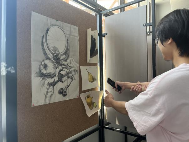 步入展厅,一幅幅风格各异的艺术作品跃然眼前:水彩画的斑斓色彩渲染出古建筑的沧桑与静谧,素描的细腻笔触捕捉生活物品的真实状况,速写的灵动线条勾勒出生活的诗意瞬间。展览特别聚焦“艺术疗愈”主题,多幅作品通过温暖色调与静谧场景,传递宁静与希望的力量。例如《暮色归途》以柔和的晚霞与远山相映,令观者仿佛置身自然怀抱,瞬间忘却烦恼;《花开富贵》通过明艳的色彩碰撞表现花朵旺盛的生命力,展现出明媚的活力。许多同学在画作前驻足良久,细细欣赏。