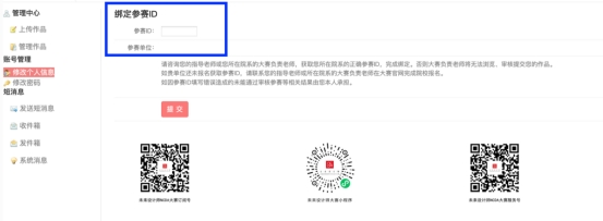 2.登录后点击修改个人信息,填写参赛院校ID(ID向负责老师获取,填写ID后自动显示对应学校,请仔细核对学校名称)。