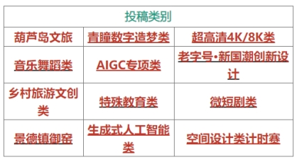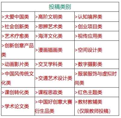 本届大赛学生组共设23个投稿类别,以每个院校不同的二级学院(系)为投稿单位,每个类别(论文类除外,论文类每个学生或老师,只能投稿一篇论文,且为未发表过,以及与创意、设计、数字媒体等相关专业有关的文章)最多投搞20件作品;教师组24个类别,教师作品投稿数量不限。