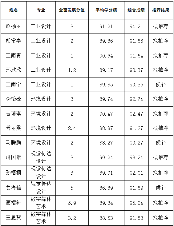 根据《bwin必赢线路检测推荐优秀应届本科毕业生免试攻读研究生工作实施办法》《艺术与设计学院2026年推荐优秀应届本科毕业生免试攻读硕士学位研究生遴选工作实施细则》,经个人申请,院内答辩专家认定,学院推免生遴选工作小组复核,学院党委会、党政联席会通过,确定以下11名同学为艺术与设计学院免试攻读研究生拟推荐人选。同时公示3名候补人员,拟推荐人员如有放弃或其他不符合推免资格者按《437ccm必赢国际版2026年推荐优秀应届本科毕业生免试攻读硕士学位研究生实施细则》中相关规定依次递补。公示期9月10-12日,如有异议请在公示期内反映,联系人许老师,联系电话:2311192。