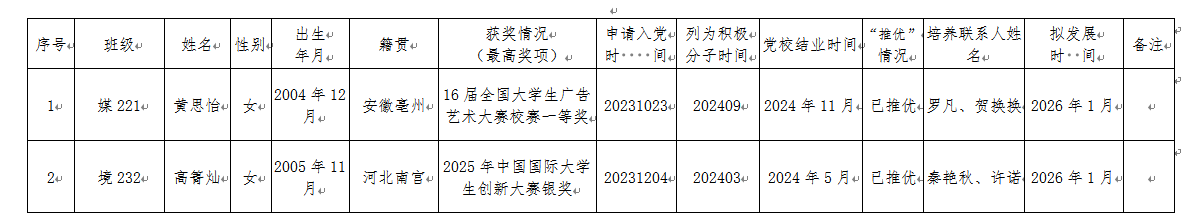 经党支部研究,拟吸收黄思怡等2位同志为中共预备党员,现将他们的有关情况予以公示,欢迎广大党员、干部、群众通过信函、电话或直接到党支部或上级党组织反映公示对象的思想品质、现实表现、廉洁自律、培养教育等方面情况。